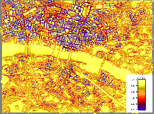The exhibition includes an irradiation map of central London created by John Mardaljevic. This shows the total annual irradiation incident on a highly detailed 3D model of virtual London.